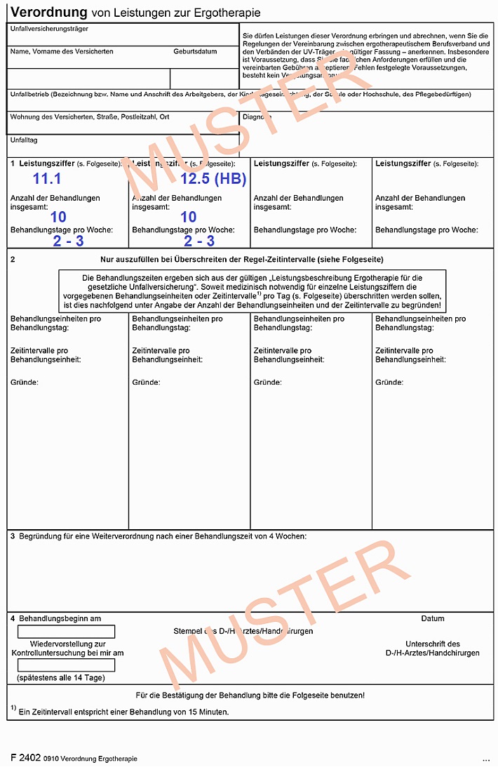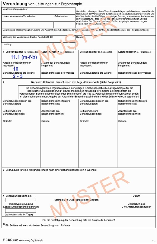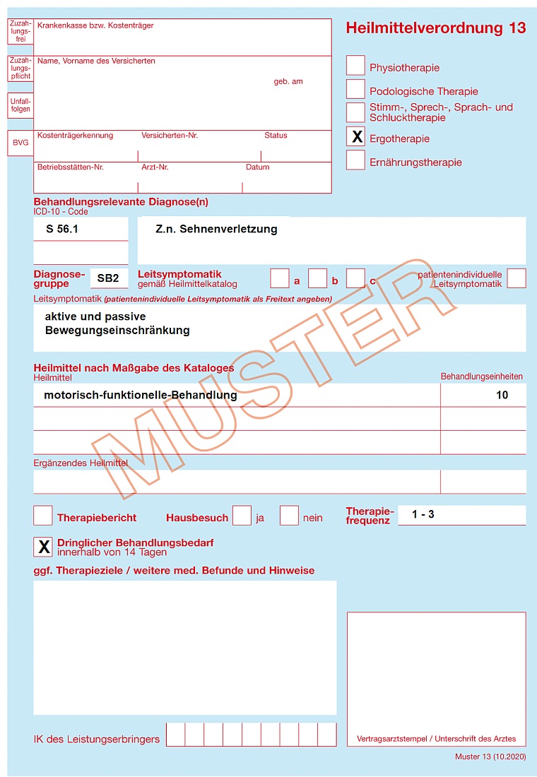 Heilmittelverordnung -Ergotherapie (Formular mit der Nr. 13 blau oder rosa oder BG-Verordnung)