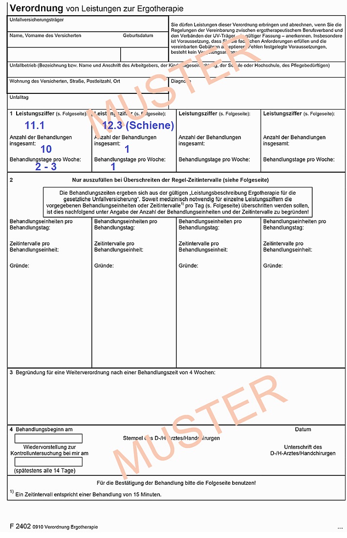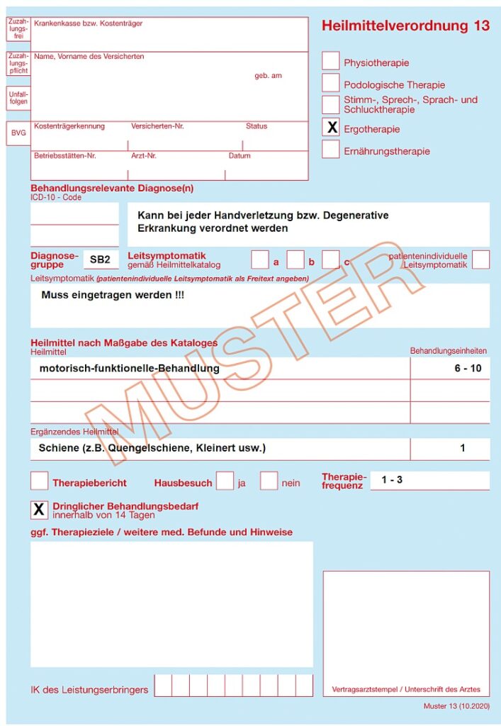 Lt. Heilmittelkatalog ist bei bestimmten IS (Indikationsschlüsseln) die Verordnung einer oder mehrerer Schienen auf dem Ergotherapie – Rezept Nr. 13 (blau oder rosa oder BG-Verordnung) möglich.