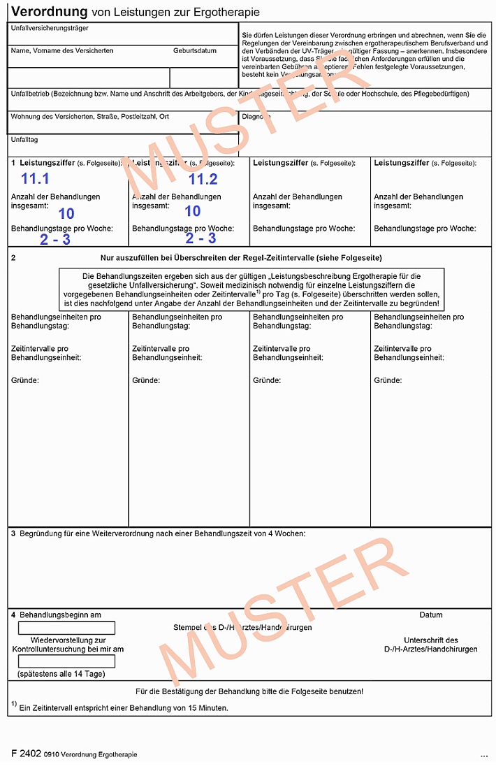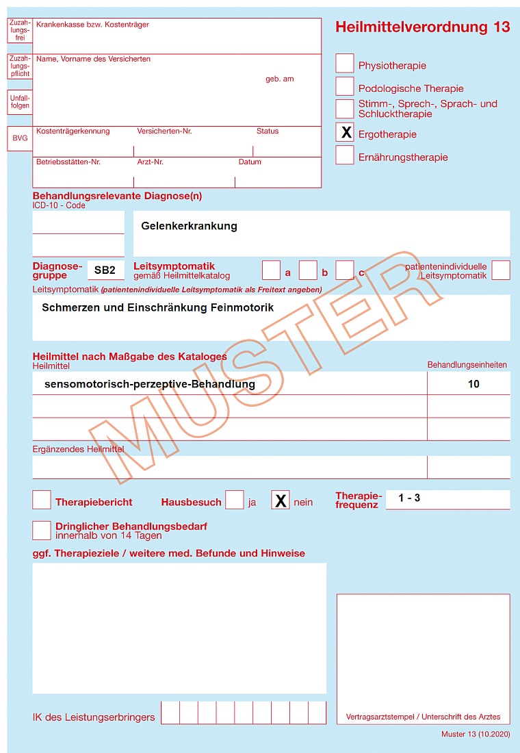 Heilmittelverordnung -Ergotherapie (Formular mit der Nr. 13 blau oder rosa oder BG-Verordnung)
