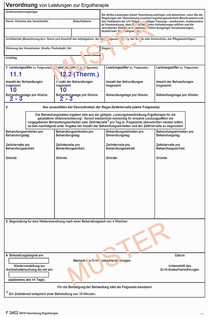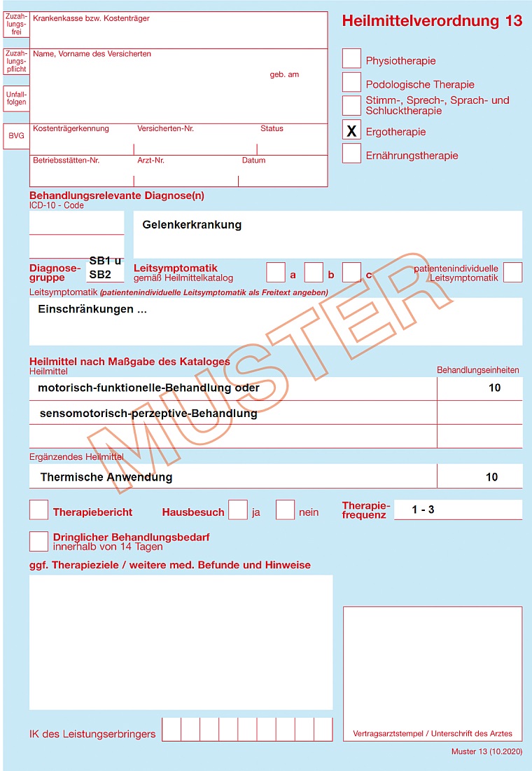 Heilmittelverordnung -Ergotherapie (Formular mit der Nr. 13 blau oder rosa oder BG-Verordnung)
